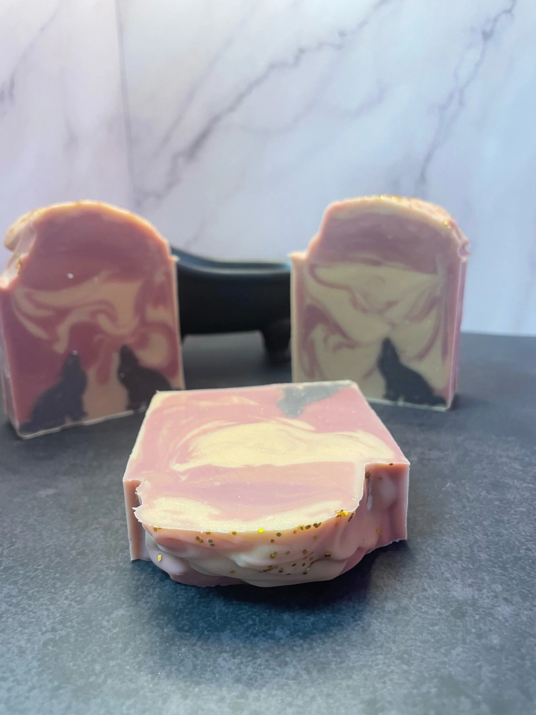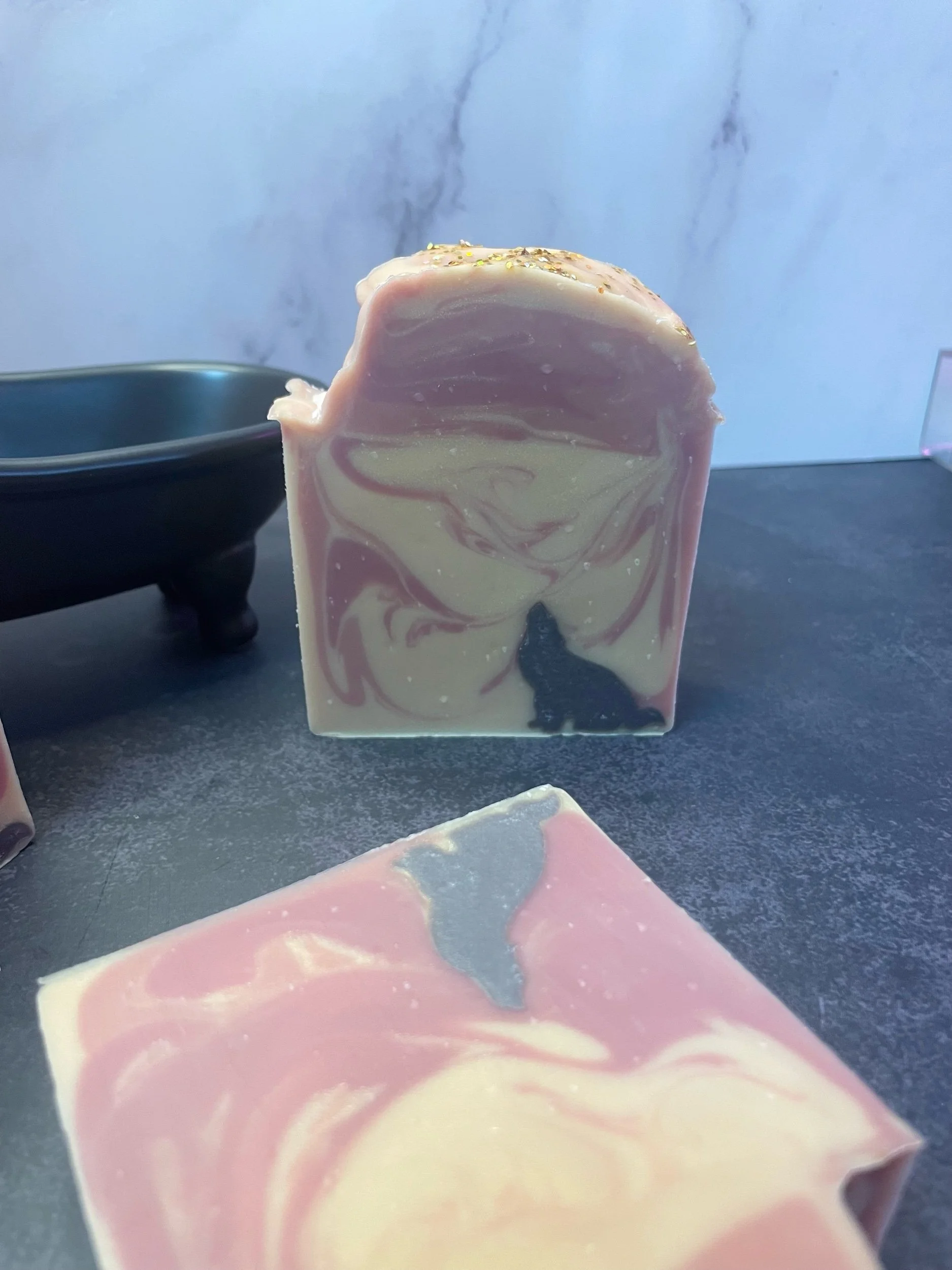 A soap bar that also benefits a local dog rescue! This relaxing looking soap bar is mixed with a howling dog in the middle and topped with biodegradable glitter. This soap bar will not only leave your skin feeling soft, clean, and feeling relaxed it will also help doggies! $1 from each bar sold will be donated to Caola’s Canine Rescue.