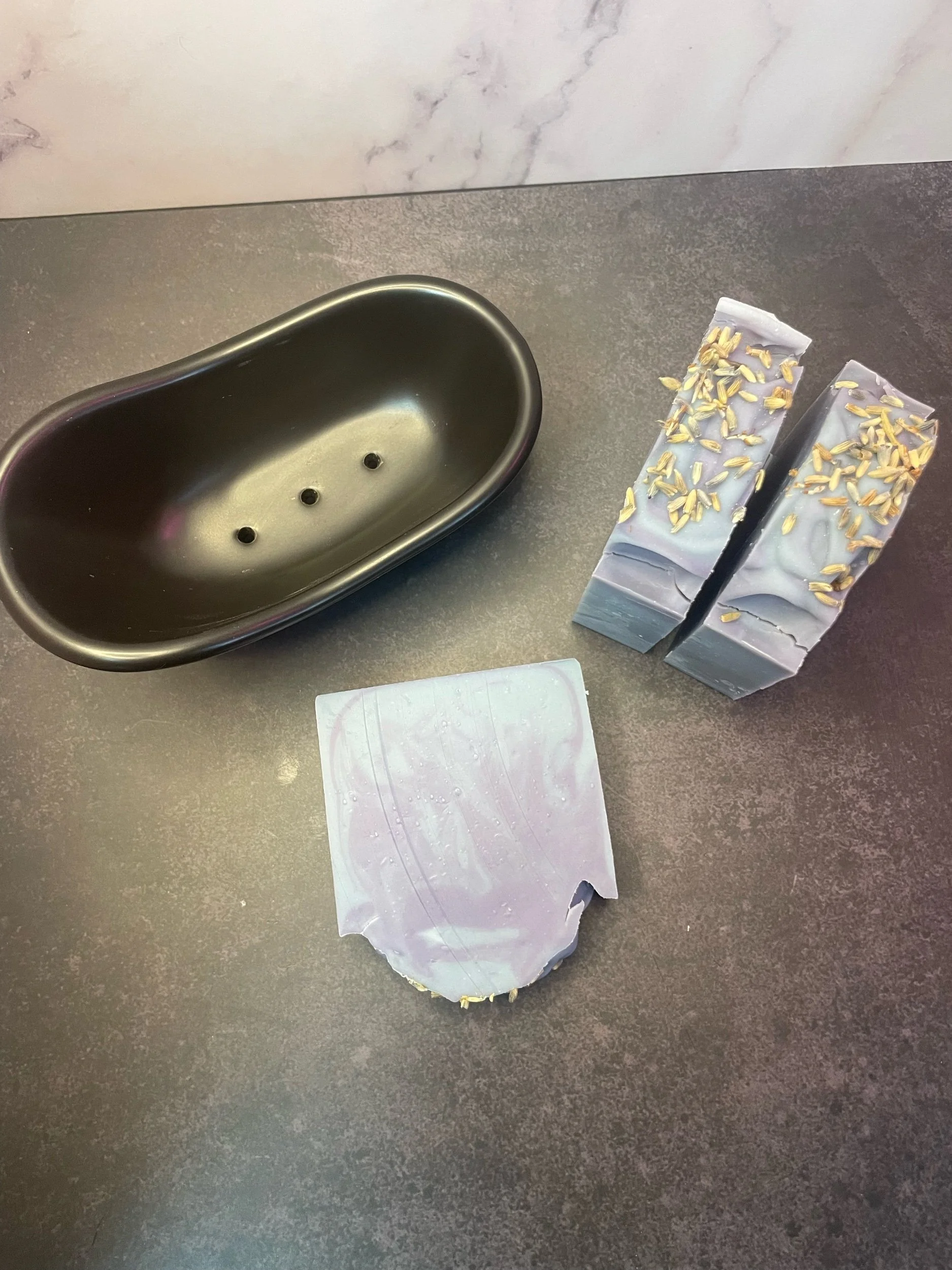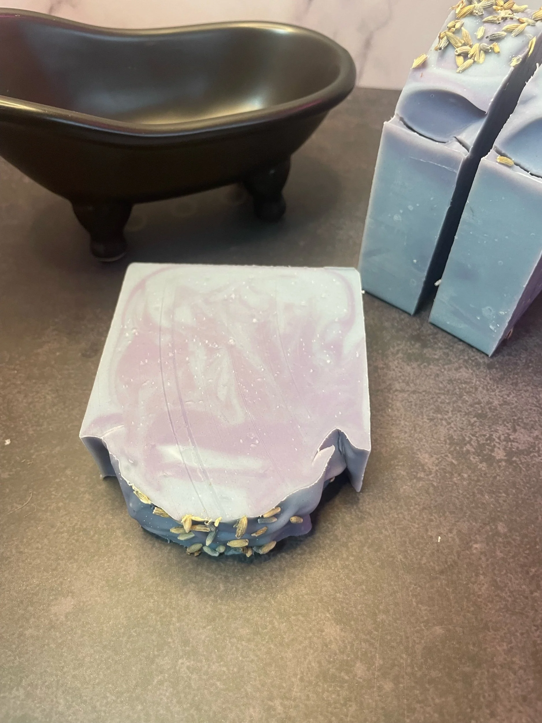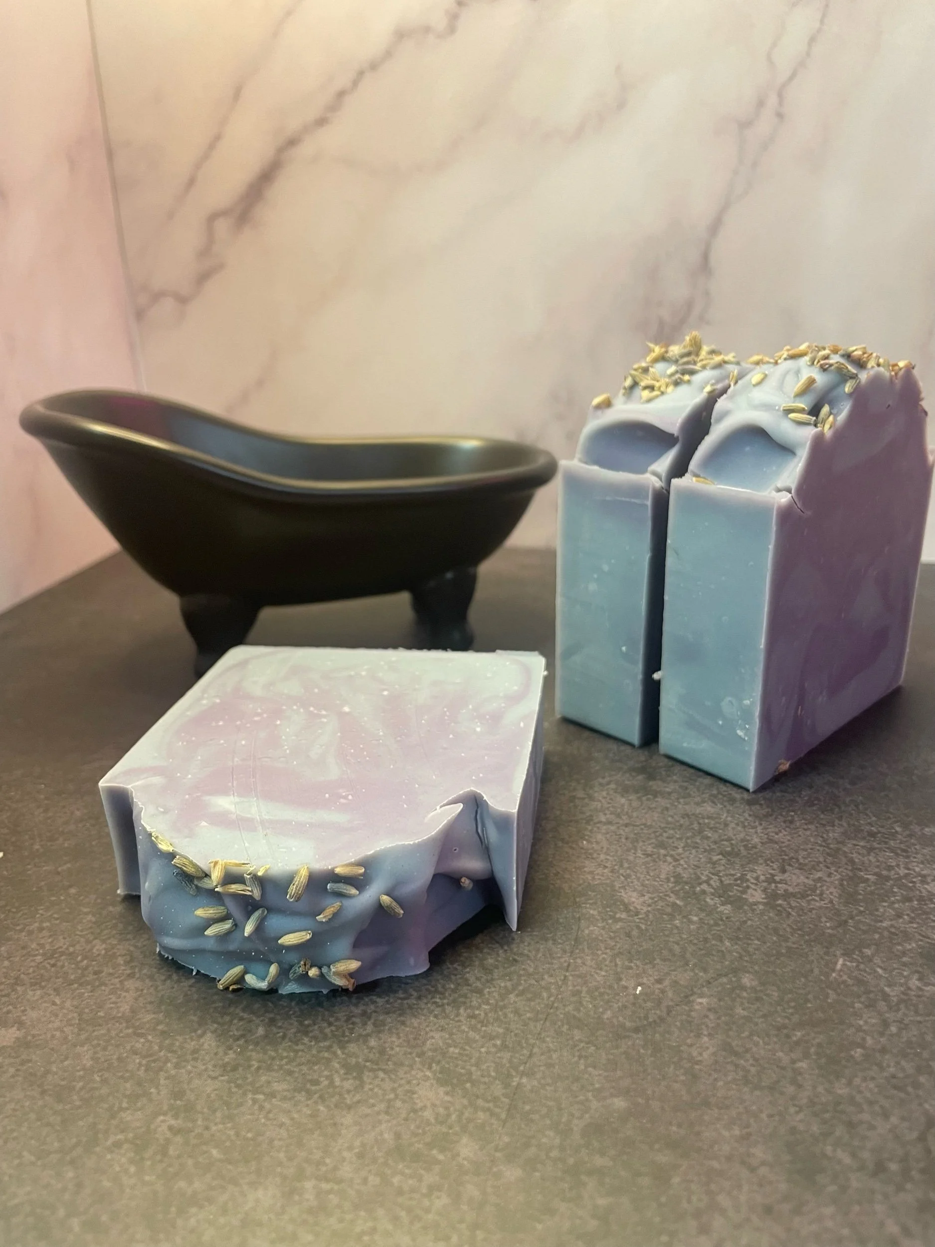 Contains Olive Oil, Water, Coconut Oil, Organic Refined Shea Butter, Sodium Hydroxide, Sweet Almond Oil, Organic Castor Oil, Mica, Activated Charcoal, Lavender, Valerian Essential Oils, and Vanilla Oleoresin